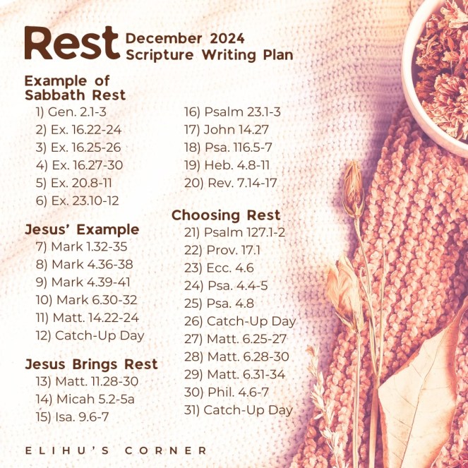 Original post @ https://elihuscorner.com/2024/11/30/rest-december-2024-scripture-writing-plan/